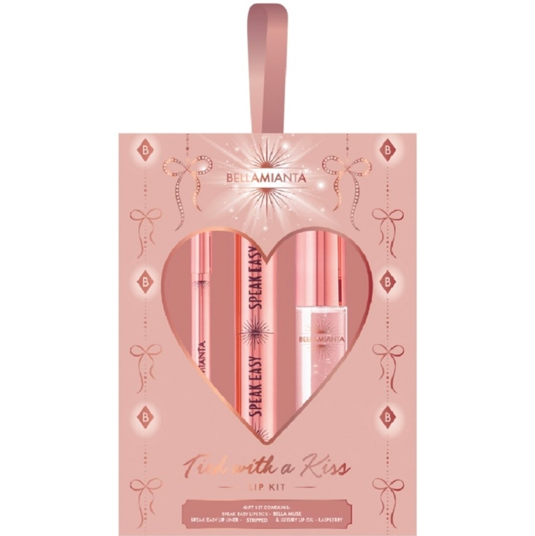 Let your lips do the talking with the Bellamianta Tied with a Kiss Speakeasy Lip Kit. This trio includes our velvety Speakeasy Lipstick in Bella Muse, offering a creamy finish and intense colour that lasts. Pair it with our precise Speakeasy Lipliner in Stripped to define and shape your lips with ease, ensuring flawless application and extended wear. Complete your look with our universal clear Speakeasy Lip Topper, adding a radiant, glossy finish and dimension to your lips. Whether worn individually or layered, this collection is essential for beauty enthusiasts for a lasting colour and a stunning finish.