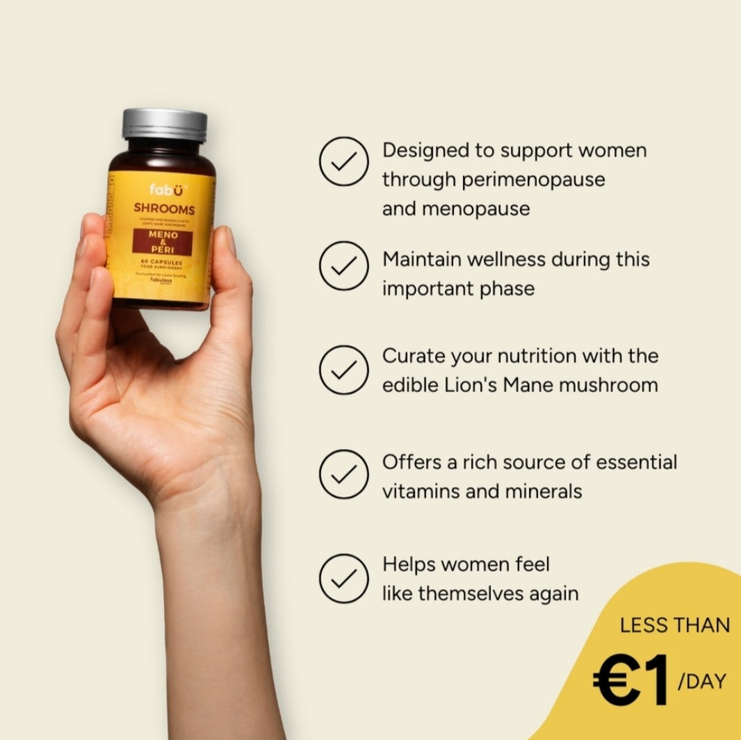 fabÜ SHROOMS MENO & PERI helps you reconnect with your vibrant, balanced self as you navigate the changes of perimenopause and menopause. This unique blend of Lion’s Mane mushroom, vitamins, and minerals supports hormonal balance, reduces fatigue, and promotes mental clarity. By supporting your body’s natural rhythms, it helps you feel more energised, calm, and in tune with your body and mind, making this transformative stage of life a little easier to embrace.