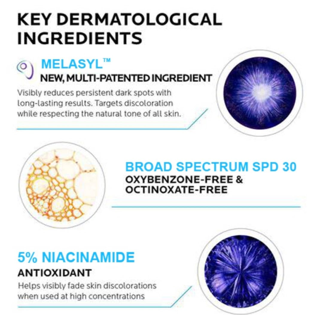 Powered by a new multi-patented Melasyl™ active and 5% pure niacinamide, the face cream visibly brightens skin and unifies the appearance of discolouration, helping to correct the look of even the most persistent dark spots. La Roche-Posay Thermal Spring Water enriches the formula to hydrate and leave skin with a more radiant appearance, while SPF 30 provides sun protection to help minimise the formation of new dark spots. With a comforting, non-sticky texture, the moisturiser can be applied daily and is suitable for use under makeup.