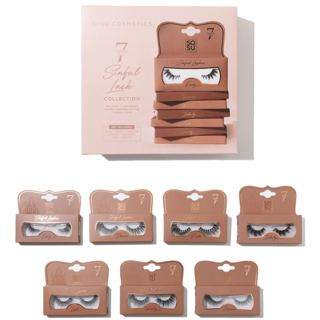 The SOSU 7 Deadly Sins Lash Collection features seven luxurious lash styles, each inspired by one of the seven deadly sins - Envy, Pride, Indulge, Desire, Deceive, Lust, and Vanity.