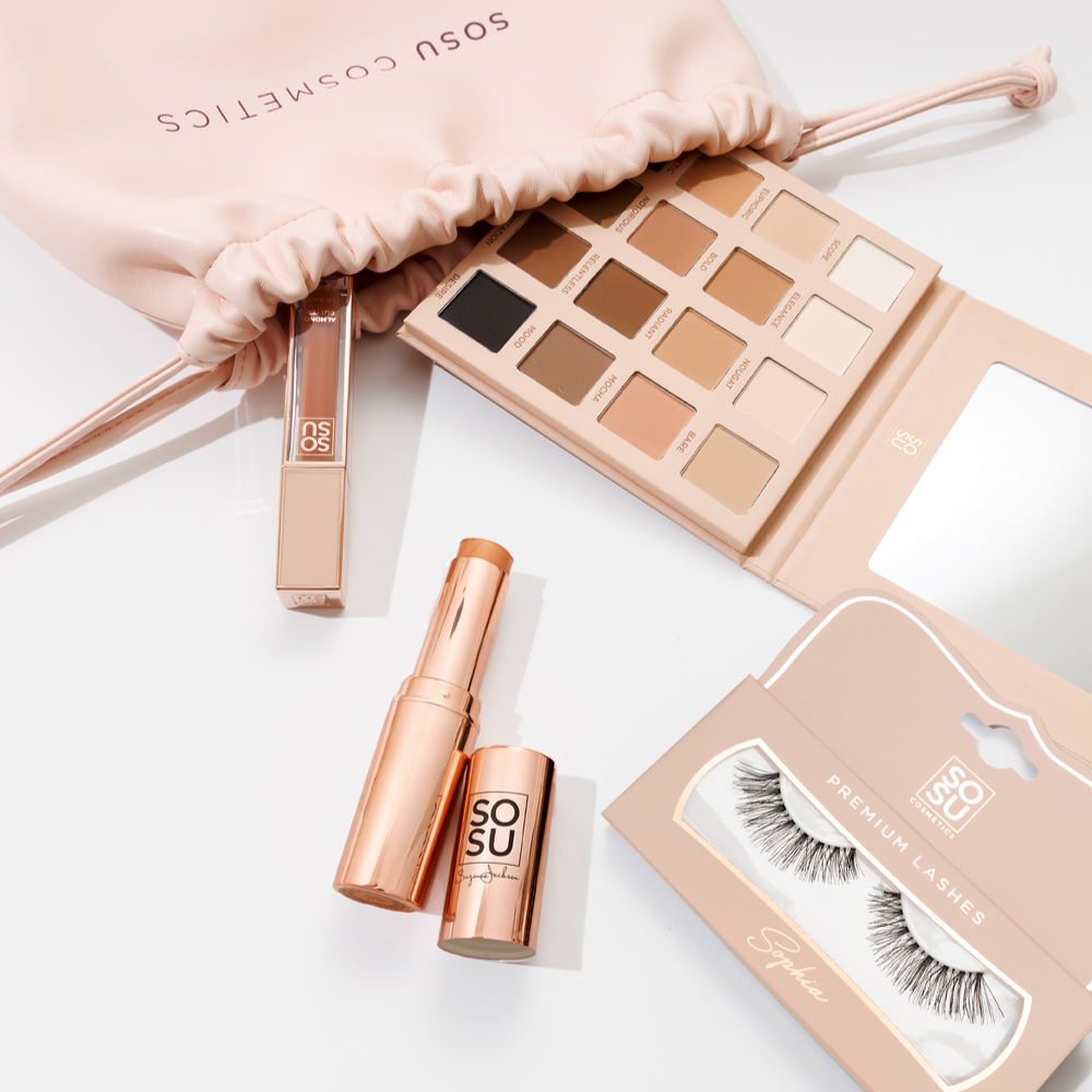 Featuring a Cream Blush Stick in Glow Coral for a fresh pop of colour, a Lip Glaze in Almond Butter for glossy perfection, the All Matte Everything Eyeshadow Palette for endless eye looks, and Premium Lashes in Sophia to elevate any glam. This set takes you from soft daytime radiance to bold evening drama with ease.